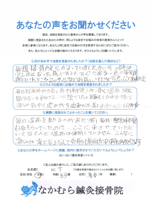 「毎日湿布を貼るのが当たり前 毎月整形外科で63枚もらっていたのにここに来させていただいてほとんど湿布は使用していません。こんなに痛みが楽になるなんて気持ちも前向きになり本当にありがとうございます。」